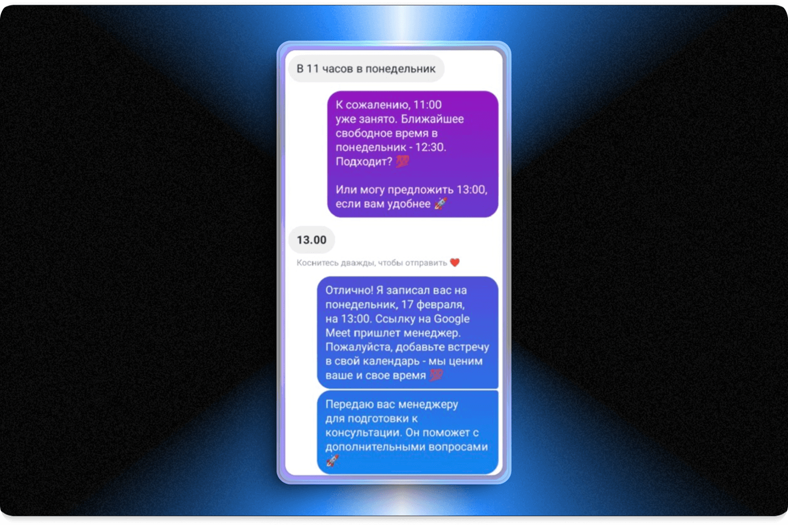 The AI assistant independently answers standard questions, qualifies leads, and collects information. Only clients ready for serious conversation reach a human manager. The team now focuses on individual consultations, complex cases, and closing deals. And because ASK Consulting operates across time zones, the 24/7 availability of the AI assistant became an integral part of their service.