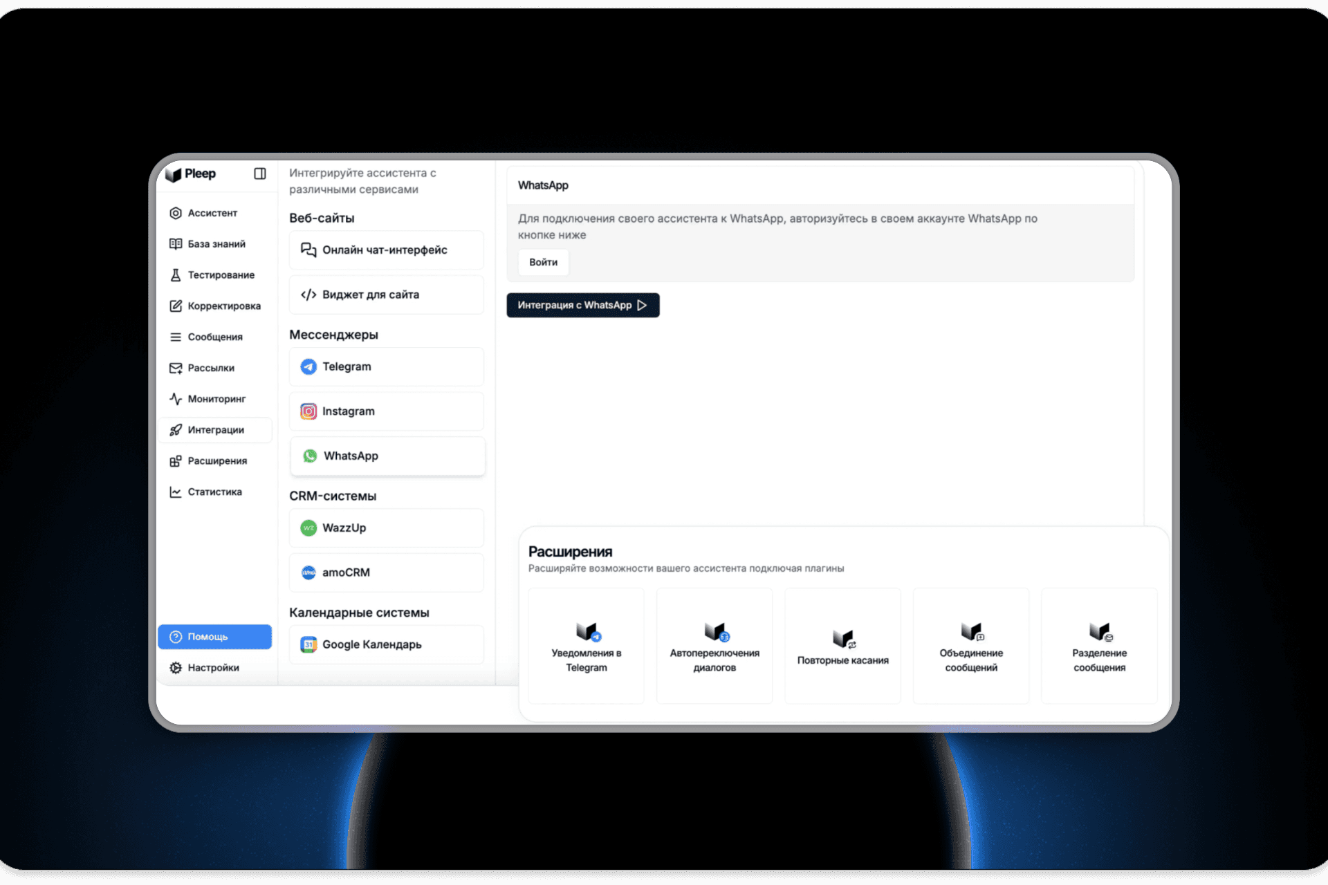- Full integration with WhatsApp, Instagram, amoCRM, and other services