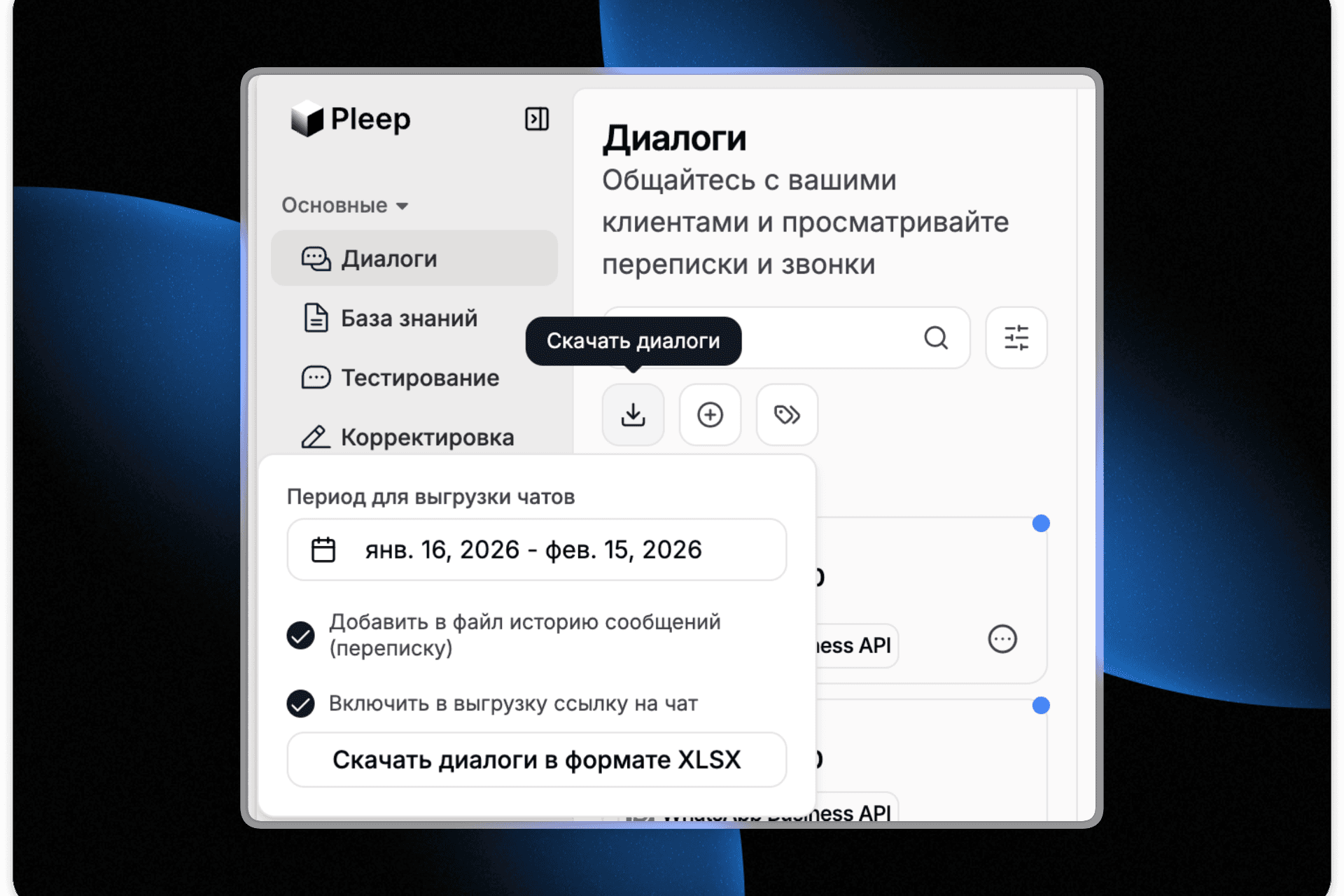 Улучшена выгрузка диалогов в разделе «Диалоги». Раньше скачивалось всё без выбора. Теперь перед выгрузкой указываете период, отмечаете нужно ли включать историю переписки и ссылки на чаты — и скачиваете только то, что нужно. В самой таблице теперь шесть колонок: платформа, контакт клиента, дата создания диалога, дата последнего сообщения, статус и прямая ссылка на чат в дашборде.