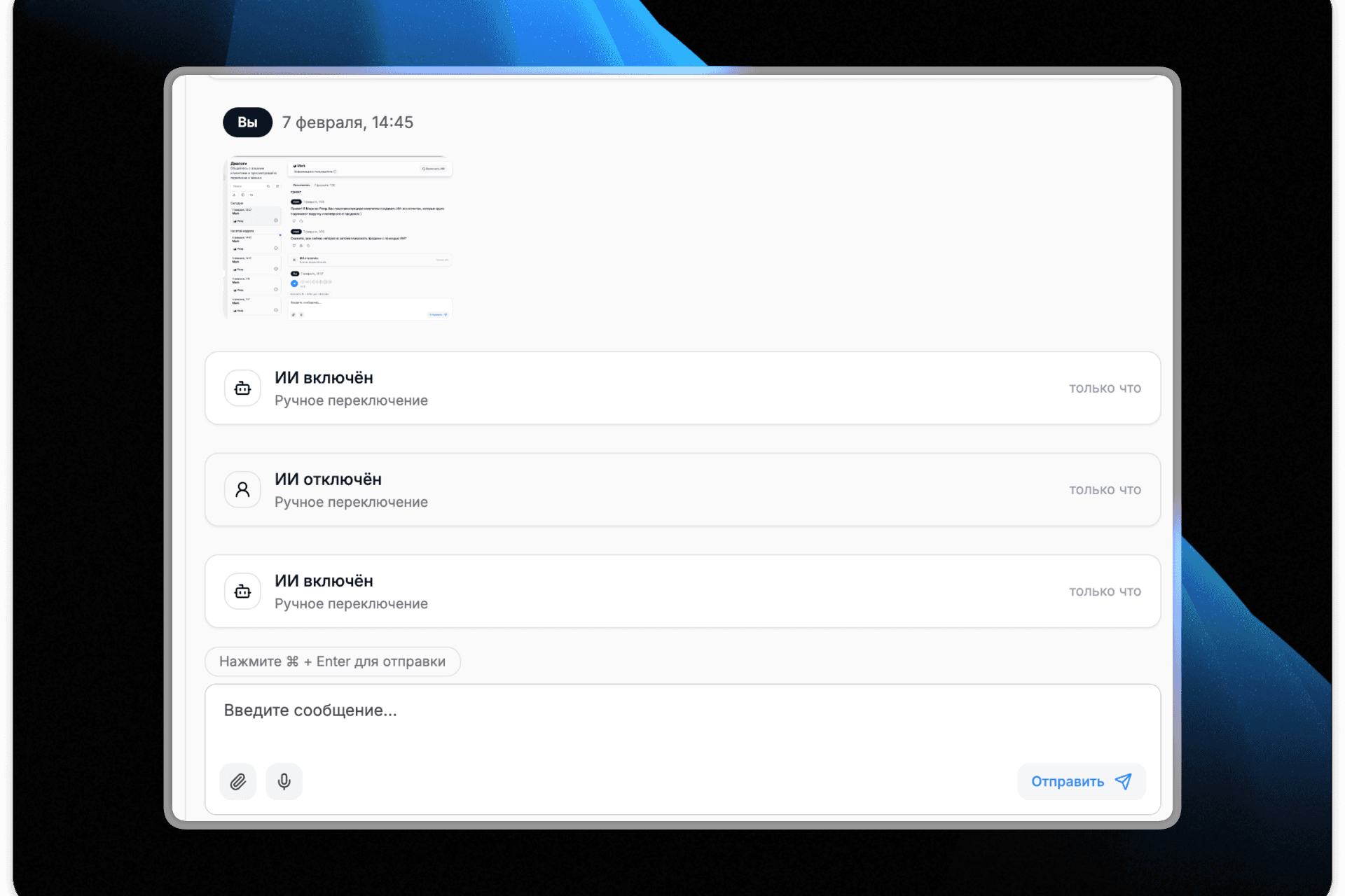 Это помогает понять, почему ИИ перестал отвечать в конкретном диалоге и на каком этапе клиент был передан живому оператору. Особенно полезно при анализе сложных кейсов и настройке правил автоматизации.