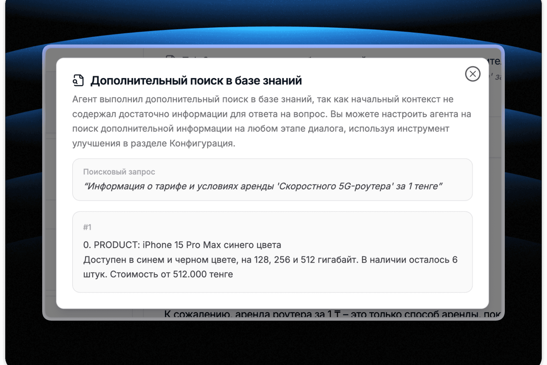 → Клиент спрашивает о продукте, которого не было в начальном контексте — ИИ ищет информацию о нём