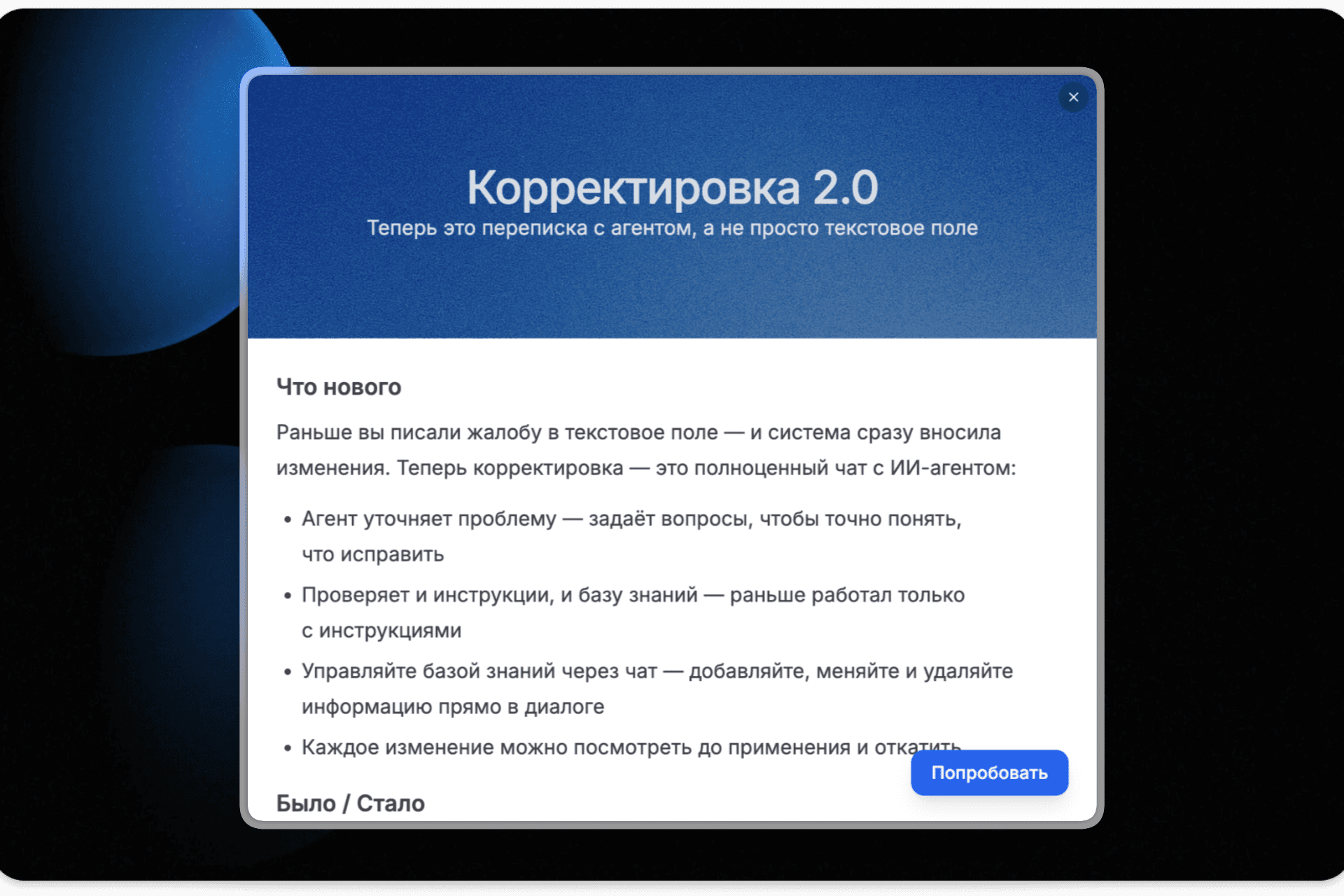 Improvement is now a conversation with an AI agent, not a text field. Previously, you had to describe the issue yourself, and the system would blindly apply changes. Now the AI agent investigates the situation first — asking clarifying questions, reviewing context — and only then suggests a specific fix. Before anything is applied, you can see exactly what will change and roll it back if needed.