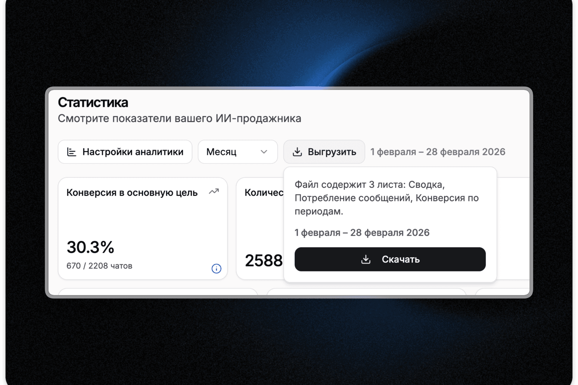 Statistics can now be exported to Excel for any time period. In the "Statistics" section, there's a new "Export" button — select a date range and download an XLSX file with three sheets: "Summary" with key metrics (conversations, AI messages, follow-ups), "Message Consumption" with a daily breakdown, and "Conversion by Period" with daily conversion rates. Great for client reports or month-over-month comparisons.