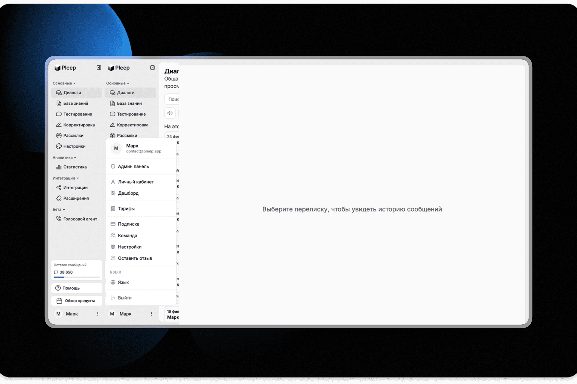 Боковая панель стала компактнее. Раньше в ней было много пунктов — рабочие разделы вперемешку с настройками аккаунта. Теперь всё, что не связано с ежедневной работой, перенесено в попап: он открывается по клику на имя аккаунта внизу слева. Там находятся личный кабинет, тарифы, подписка, управление командой, настройки, выбор языка и выход. В самой боковой панели остались только разделы, которые нужны в работе каждый день.