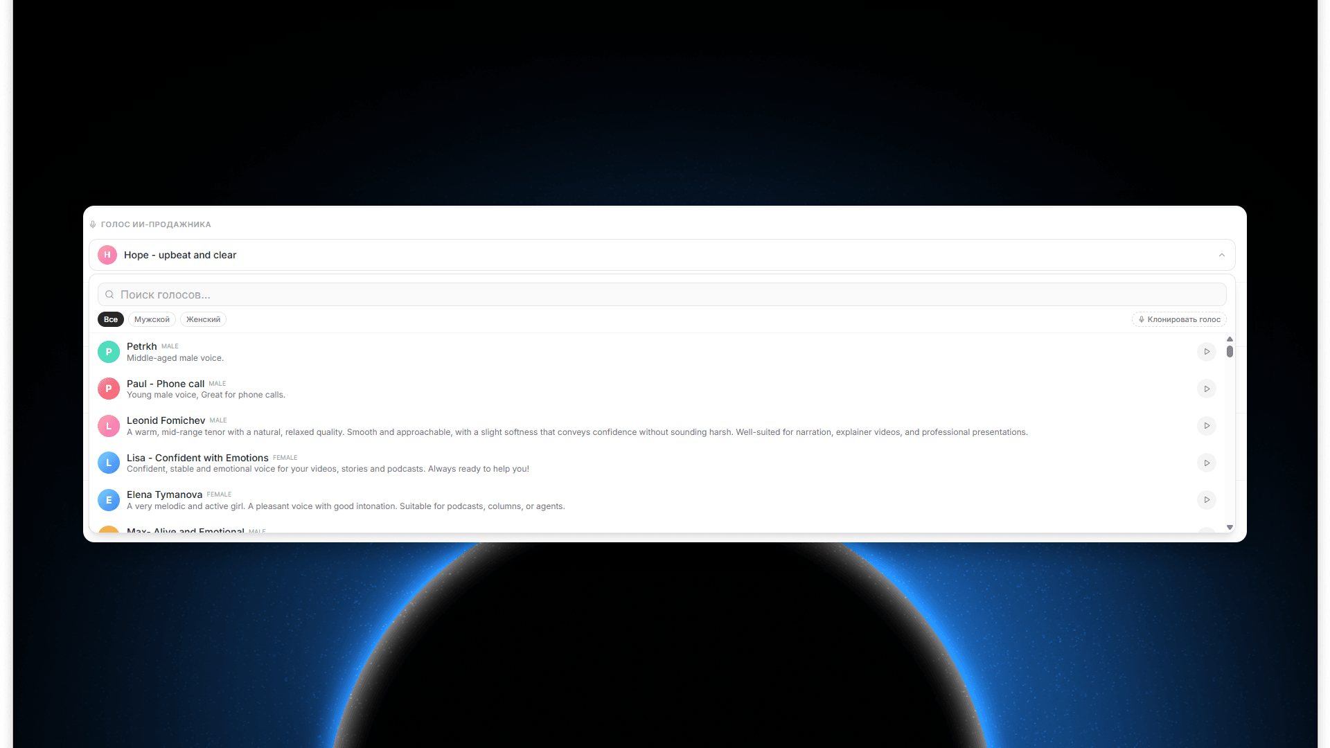 Для голосовых агентов теперь доступно значительно больше голосов. Голоса автоматически сортируются под выбранный язык — например, при выборе русского языка в начале списка будут отображаться наиболее подходящие голоса.